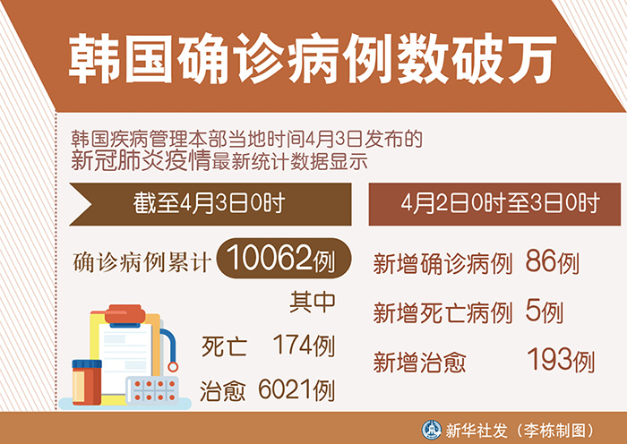 新華社首爾4月3日電(記者陸睿)韓國(guó)疾病管理本部3日發(fā)布的新冠肺炎疫情最新統(tǒng)計(jì)數(shù)據(jù)顯示,截至3日0時(shí),韓國(guó)確診病例累計(jì)達(dá)10062例,其中死亡174例,治愈6021例。