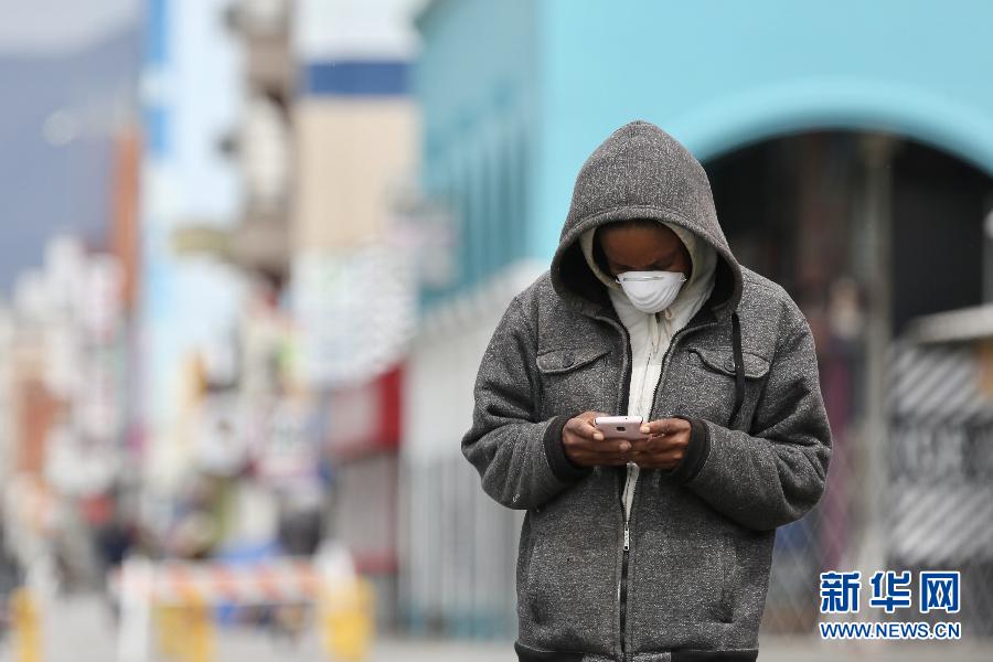 4月10日,一名戴口罩的行人在美國(guó)洛杉磯威尼斯海灘看手機(jī)。 為減緩新冠病毒的傳播,洛杉磯市長(zhǎng)7日下令,民眾在公共營(yíng)業(yè)場(chǎng)所要戴口罩或用織物遮擋住臉,這一行政令于2020年4月10日生效。 新華社發(fā)