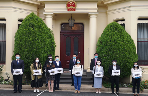 中國(guó)駐墨爾本總領(lǐng)館轄區(qū)內(nèi)多所大學(xué)的學(xué)生代表參加發(fā)放儀式并領(lǐng)取了“健康包”。教育參贊郭春鳴,協(xié)助發(fā)放工作的維州中文教師協(xié)會(huì)、澳洲國(guó)際商學(xué)院的代表也出席了儀式。