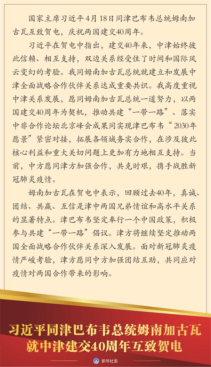 新華社北京4月18日電 國家主席習(xí)近平4月18日同津巴布韋總統(tǒng)姆南加古瓦互致賀電,慶祝兩國建交40周年。