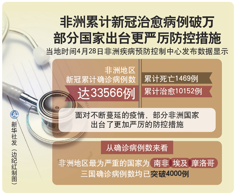新華社洛美4月28日電 綜合新華社駐非洲地區(qū)記者報(bào)道:非洲疾病預(yù)防控制中心28日發(fā)布數(shù)據(jù)顯示,非洲地區(qū)新冠累計(jì)確診病例數(shù)達(dá)33566例,累計(jì)死亡1469例,累計(jì)治愈10152例。面對(duì)不斷蔓延的疫情,部分非洲國(guó)家出臺(tái)了更加嚴(yán)厲的防控措施。