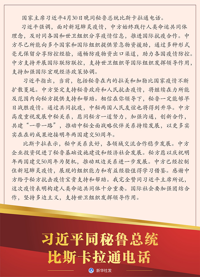 習近平指出,當前,包括秘魯在內(nèi)的拉美和加勒比國家疫情不斷擴散蔓延。中方堅定支持秘魯政府和人民抗擊疫情,將繼續(xù)在力所能及范圍內(nèi)向秘方提供支持和幫助。相信在你領導下,秘魯一定能夠早日戰(zhàn)勝疫情。通過共同抗疫,中秘兩國人民友誼也將得到升華。中方高度重視發(fā)展中秘關系,愿同秘方一道努力,加強溝通,創(chuàng)新合作,共建“一帶一路”,推動中秘全面戰(zhàn)略伙伴關系持續(xù)發(fā)展,以更多實實在在的成果迎接明年兩國建交50周年。
