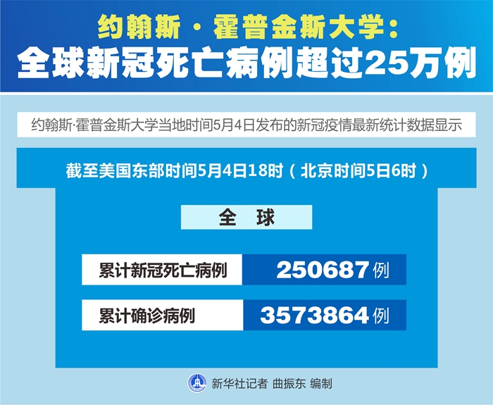 新華社紐約5月4日電? 美國約翰斯·霍普金斯大學4日發(fā)布的新冠疫情最新統(tǒng)計數(shù)據(jù)顯示,全球累計新冠死亡病例超過25萬例。