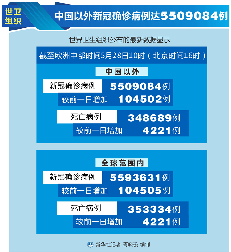 世衛(wèi)組織每日疫情報(bào)告顯示,截至歐洲中部時(shí)間28日10時(shí)(北京時(shí)間16時(shí)),中國以外新冠確診病例較前一日增加104502例,達(dá)到5509084例;中國以外死亡病例較前一日增加4221例,達(dá)到348689例。