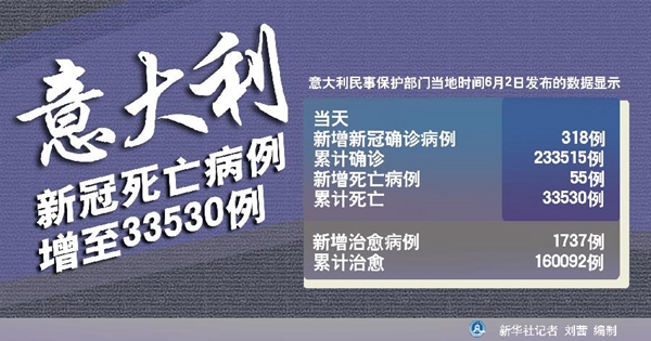 新華社羅馬6月2日電(記者陳占杰)意大利民事保護部門2日發(fā)布的數據顯示,該國當天新增新冠確診病例318例,累計確診233515例;新增死亡病例55例,累計死亡33530例。