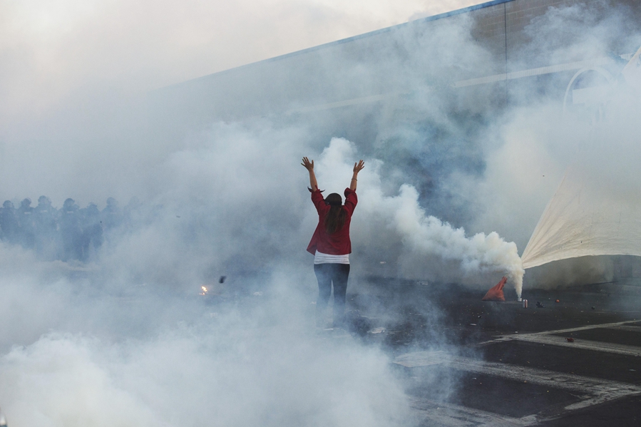 5月30日晚,在美國明尼蘇達州明尼阿波利斯市,抗議者在防暴警察施放的催淚瓦斯中與警察對峙。新華社發(fā)(安格斯·亞歷山大攝)