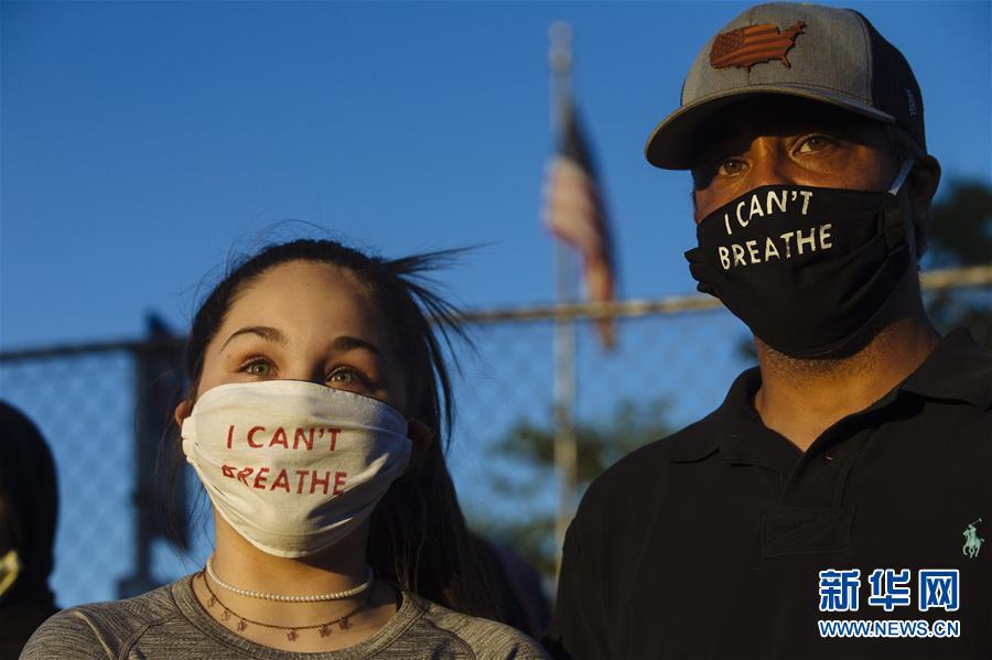 5月30日晚,在美國明尼蘇達州明尼阿波利斯市,抗議者面戴寫有“我無法呼吸”的口罩,參加抗議活動。新華社發(fā)(安格斯·亞歷山大攝)