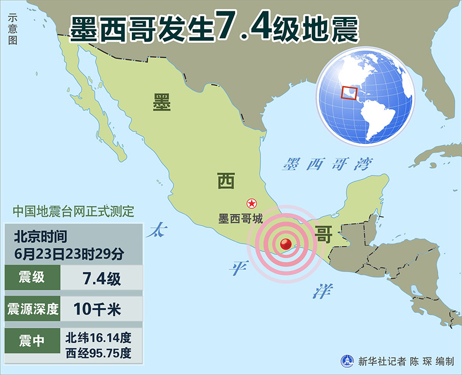 新華社北京6月23日電 據(jù)中國地震臺網(wǎng)正式測定:6月23日23時29分在墨西哥(北緯16.14度,西經(jīng)95.75度)發(fā)生7.4級地震,震源深度10千米。