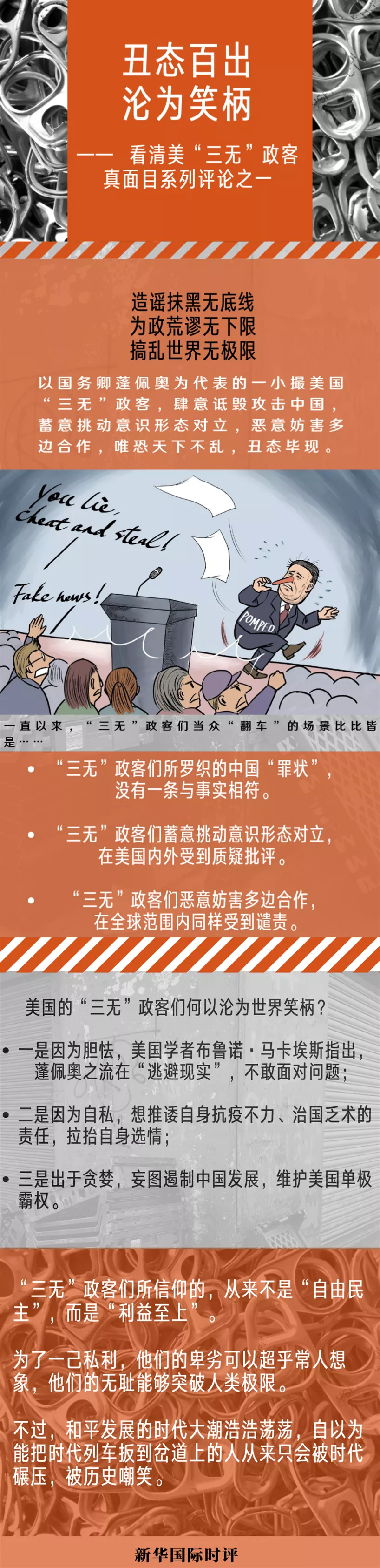 一段時(shí)間以來,以國務(wù)卿蓬佩奧為代表的一小撮造謠抹黑無底線、為政荒謬無下限、搞亂世界無極限的美國“三無”政客,肆意詆毀攻擊中國,蓄意挑動(dòng)意識(shí)形態(tài)對(duì)立,惡意妨害多邊合作,唯恐天下不亂,丑態(tài)畢現(xiàn)。