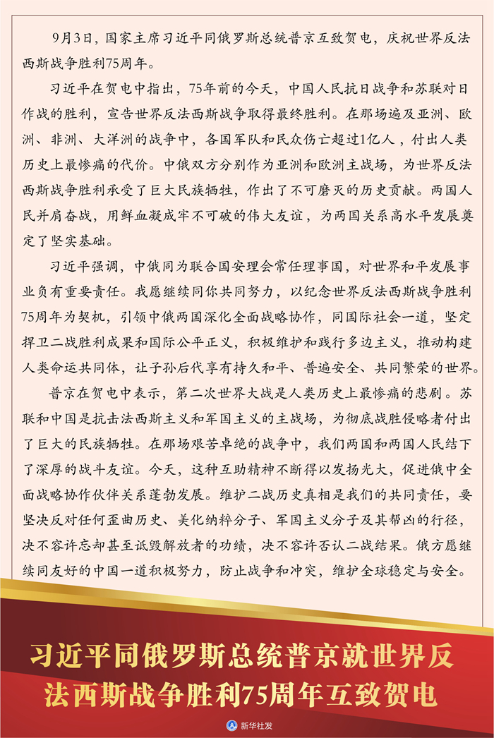 習近平在賀電中指出,75年前的今天,中國人民抗日戰(zhàn)爭和蘇聯對日作戰(zhàn)的勝利,宣告世界反法西斯戰(zhàn)爭取得最終勝利。在那場遍及亞洲、歐洲、非洲、大洋洲的戰(zhàn)爭中,各國軍隊和民眾傷亡超過1億人,付出人類歷史上最慘痛的代價。中俄雙方分別作為亞洲和歐洲主戰(zhàn)場,為世界反法西斯戰(zhàn)爭勝利承受了巨大民族犧牲,作出了不可磨滅的歷史貢獻。兩國人民并肩奮戰(zhàn),用鮮血凝成牢不可破的偉大友誼,為兩國關系高水平發(fā)展奠定了堅實基礎。