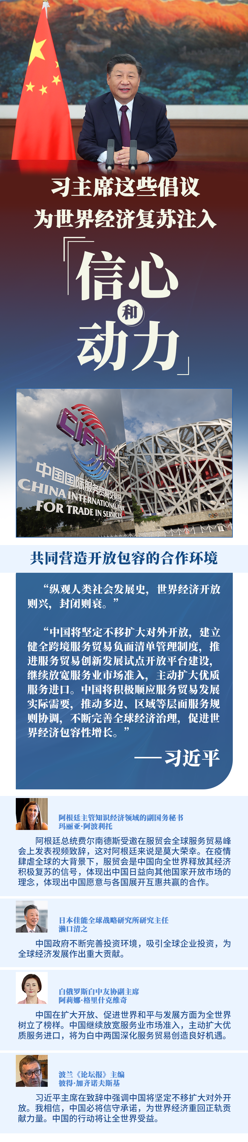 在全球范圍新冠疫情尚未得到全面控制、經(jīng)濟全球化遭遇逆流的背景下,習主席就促進全球服務(wù)業(yè)開放合作提出3點倡議,為推動世界經(jīng)濟盡快復蘇注入信心和動力,向國際社會展現(xiàn)中國負責任大國的作為和擔當。