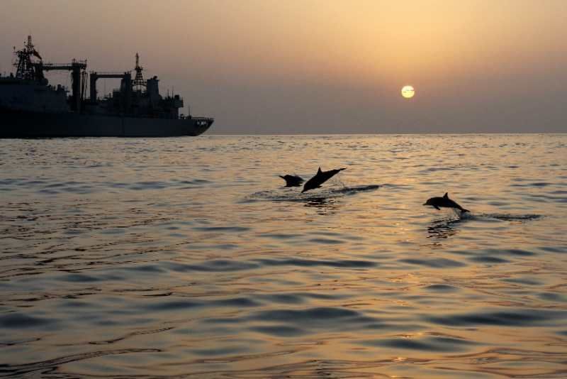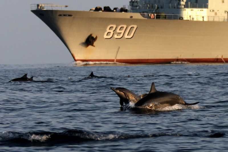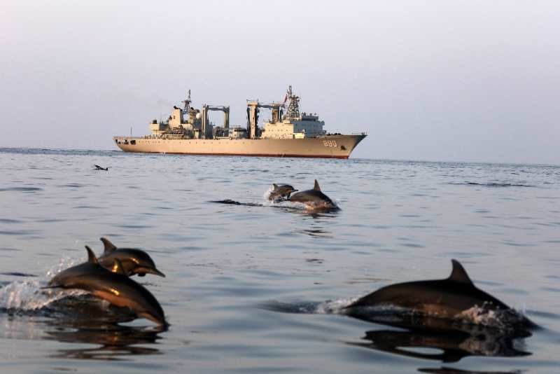 中國海軍赴亞丁灣索馬里海域護航編隊始終秉持海洋命運共同體理念,堅持人與大海和諧相處,注重生態(tài)環(huán)境保護,贏得大自然積極回報,經(jīng)常出現(xiàn)編隊艦艇航行時有成群海豚伴航、待機集結(jié)時有各類魚群相伴的和諧場景。