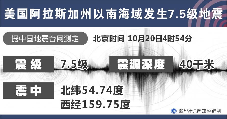 新華社快訊:中國地震臺網正式測定,10月20日4時54分在美國阿拉斯加州以南海域(北緯54.74度,西經159.75度)發(fā)生7.5級地震,震源深度40千米。