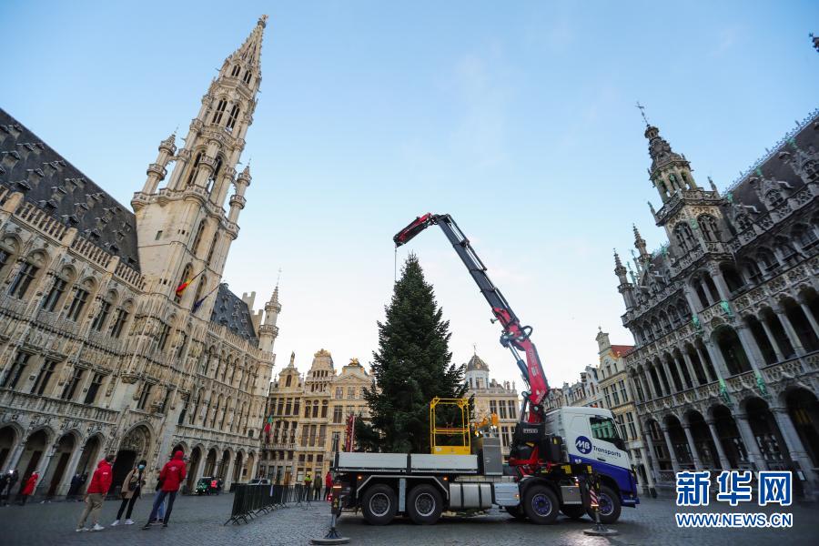 這是11月19日在比利時(shí)布魯塞爾大廣場(chǎng)拍攝的圣誕樹(shù)安裝現(xiàn)場(chǎng)。