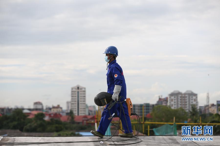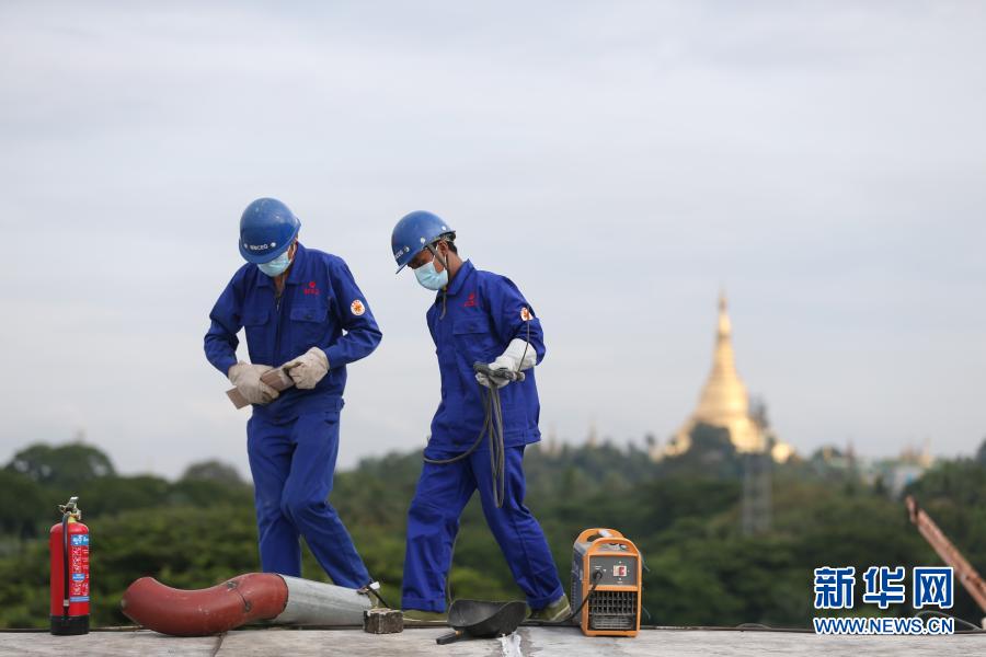 22歲的緬甸工人覺(jué)泰昂正在屋頂焊接管道,飛揚(yáng)的藍(lán)色焊花和他身后不遠(yuǎn)處的瑞德貢大金塔構(gòu)成一幅美麗圖景。