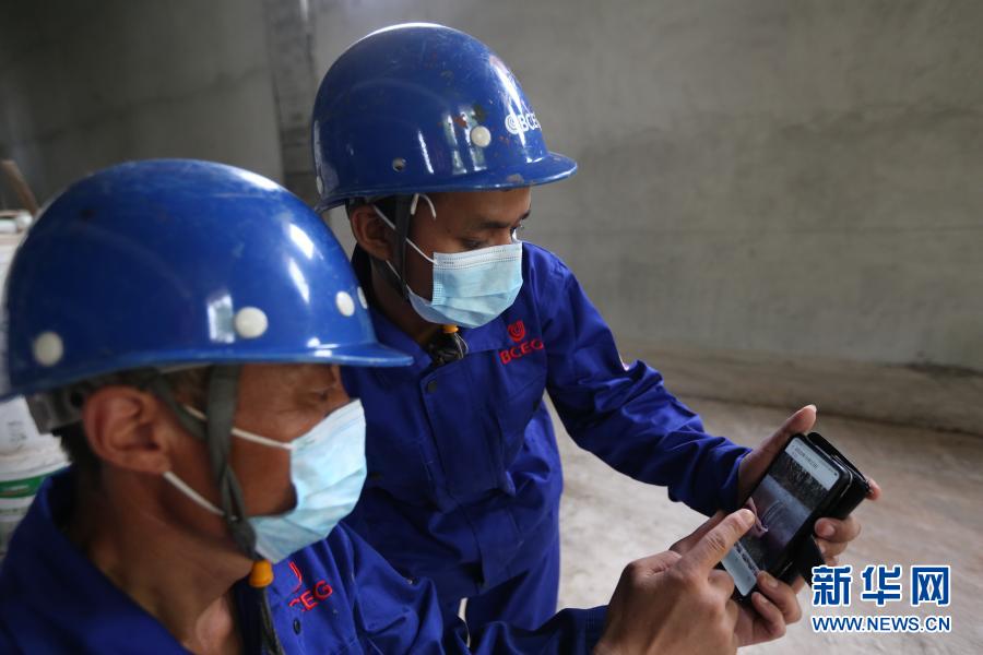 10月28日,在緬甸仰光的國(guó)家劇院維修改造項(xiàng)目現(xiàn)場(chǎng),覺(jué)泰昂(右)的電焊師父田志章(左)向他展示手機(jī)里的電焊技巧視頻。新華社發(fā)(吳昂攝)