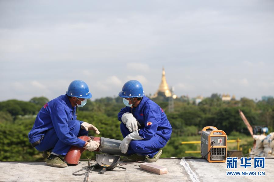 10月28日,在緬甸仰光的國(guó)家劇院維修改造項(xiàng)目現(xiàn)場(chǎng),覺(jué)泰昂在師父的指導(dǎo)下焊接鋼管。新華社發(fā)(吳昂攝)