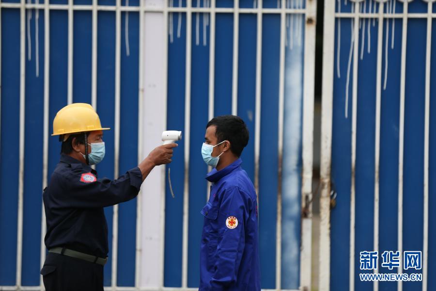 10月28日,在緬甸仰光的國(guó)家劇院維修改造項(xiàng)目現(xiàn)場(chǎng),準(zhǔn)備上班的覺(jué)泰昂(右)接受體溫測(cè)量。新華社發(fā)(吳昂攝)