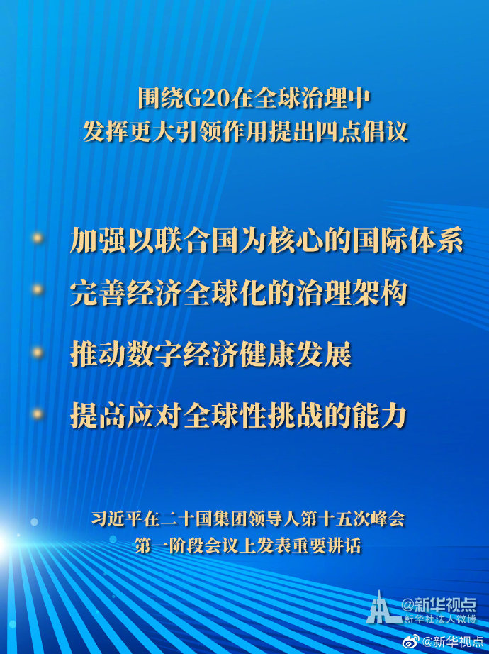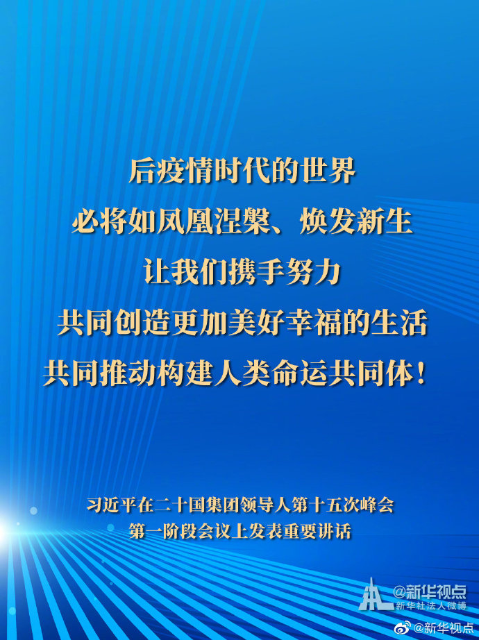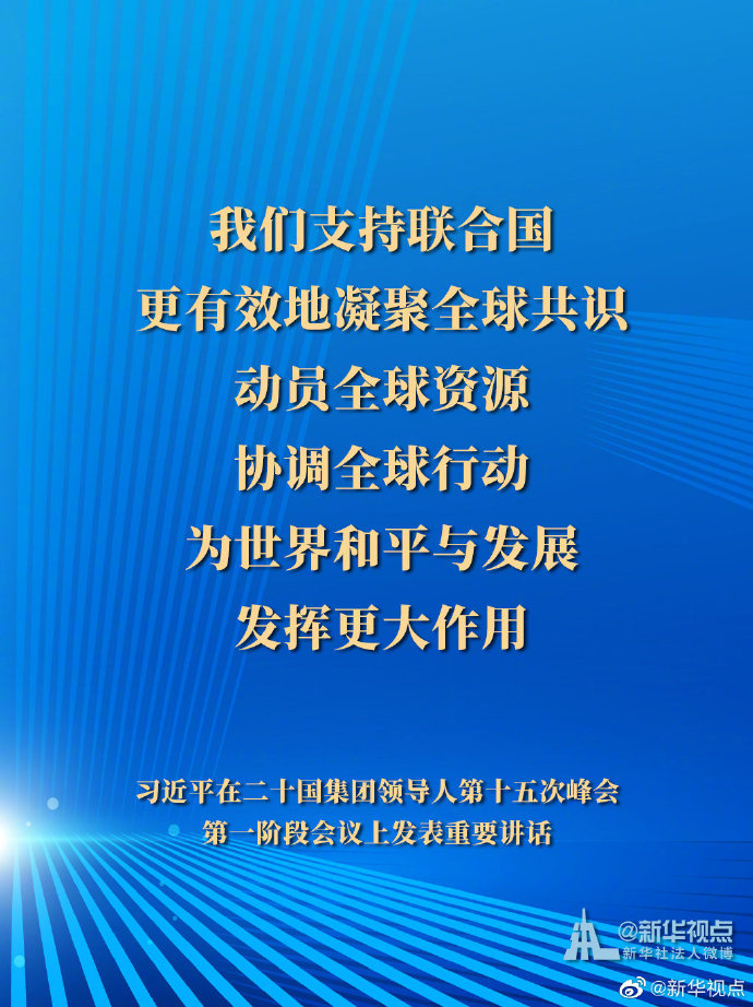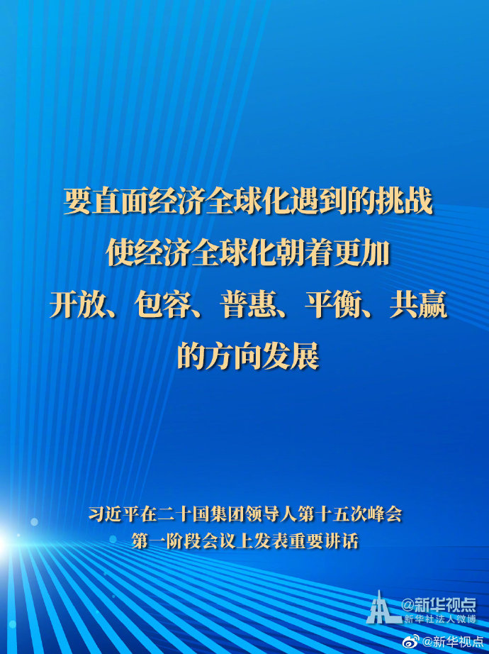 11月21日,國家主席習近平在二十國集團領(lǐng)導(dǎo)人第十五次峰會第一階段會議上發(fā)表重要講話。一起來看習主席的G20金句。