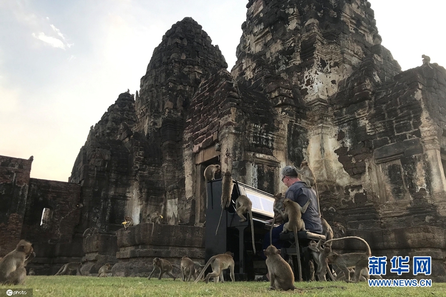 11月21日,泰國華富里府,英國鋼琴家保羅·巴頓(Paul Barton)為一群猴子彈鋼琴。演奏過程中,多只猴子在他周圍跑來跑去,有幾只還爬上了鋼琴,甚至在他的頭頂跳來跳去。巴頓稱,這場特殊的音樂會(huì)旨在引起人們對這群饑餓的猴子的重視。(圖片來源:東方IC)