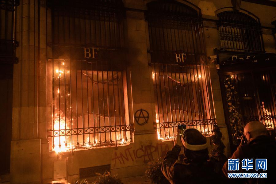 11月28日,法國巴黎巴士底廣場附近的法蘭西銀行在游行示威中起火。