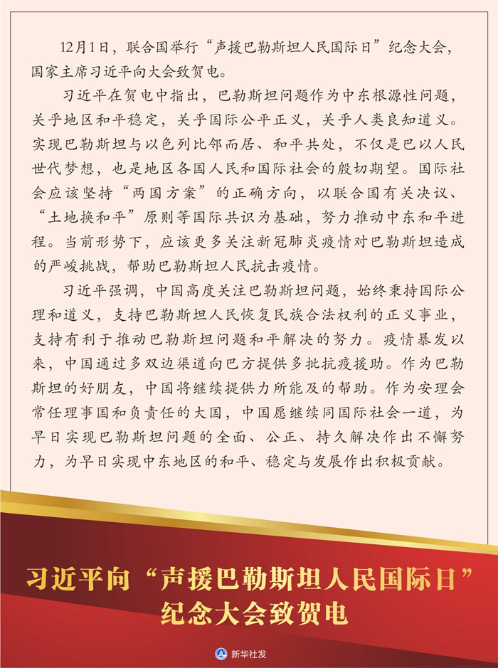 新華社北京12月2日電? 12月1日,聯(lián)合國舉行“聲援巴勒斯坦人民國際日”紀(jì)念大會,國家主席習(xí)近平向大會致賀電。