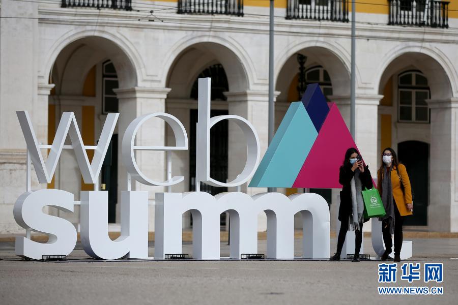 11月30日,在葡萄牙里斯本,兩名戴口罩的女子走過(guò)2020年網(wǎng)絡(luò)峰會(huì)的立體標(biāo)識(shí)。