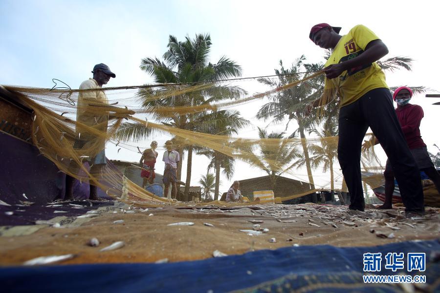 12月12日,在斯里蘭卡首都科倫坡附近的莫勒圖沃,漁民在海邊整理漁網(wǎng)。