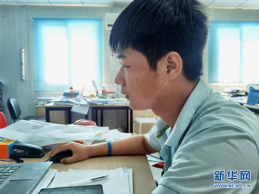 12月14日,在馬爾代夫馬累,臉上有口罩印的安全工程師劉平建在維拉納國(guó)際機(jī)場(chǎng)水飛航站樓項(xiàng)目辦公室工作。新華社發(fā)(北京城建集團(tuán)供圖)