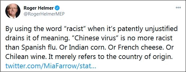 大量網(wǎng)友在他的這條推特下,挖出赫爾默曾經(jīng)發(fā)表的言論。例如早在3月17日,赫爾默就在一條推特中宣稱:“在明顯不合理的情況下,使用‘種族主義’這個(gè)詞會(huì)讓它失去意義。‘中國病毒’和‘西班牙流感’一樣不是種族主義。就像印度玉米,或法國奶酪,或者智利葡萄酒。它僅僅是指原產(chǎn)國?!?/p>