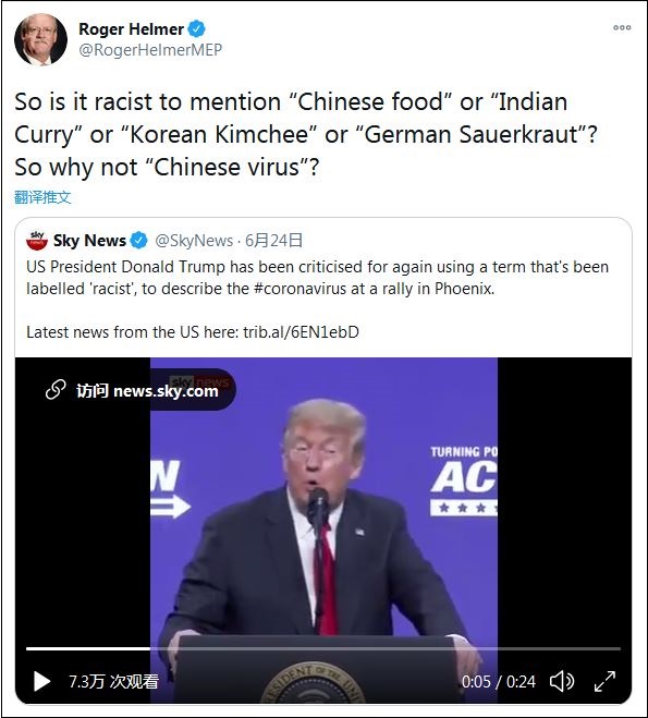 6月24日,赫爾默轉(zhuǎn)發(fā)了特朗普集會(huì)上喊“功夫病毒”的視頻,并評(píng)論稱:“說中國菜、印度菜、韓國泡菜或德國酸菜是種族歧視嗎?那么,為什么‘中國病毒’(是呢)?”