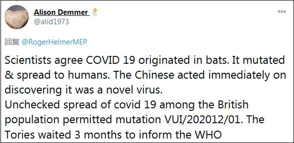 還有一名網(wǎng)友對(duì)比稱:“科學(xué)家同意新冠病毒起源自蝙蝠,變異后傳播給人類,中國人發(fā)現(xiàn)這是一種新病毒后,立即采取了行動(dòng)。新冠病毒在英國人口中無限制的傳播,導(dǎo)致了變異新冠病毒(VUI/202012/01),保守黨等了3個(gè)月才通知世衛(wèi)組織?!?/p>