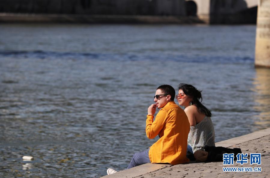 3月24日,一對情侶在法國巴黎塞納河畔曬太陽。
