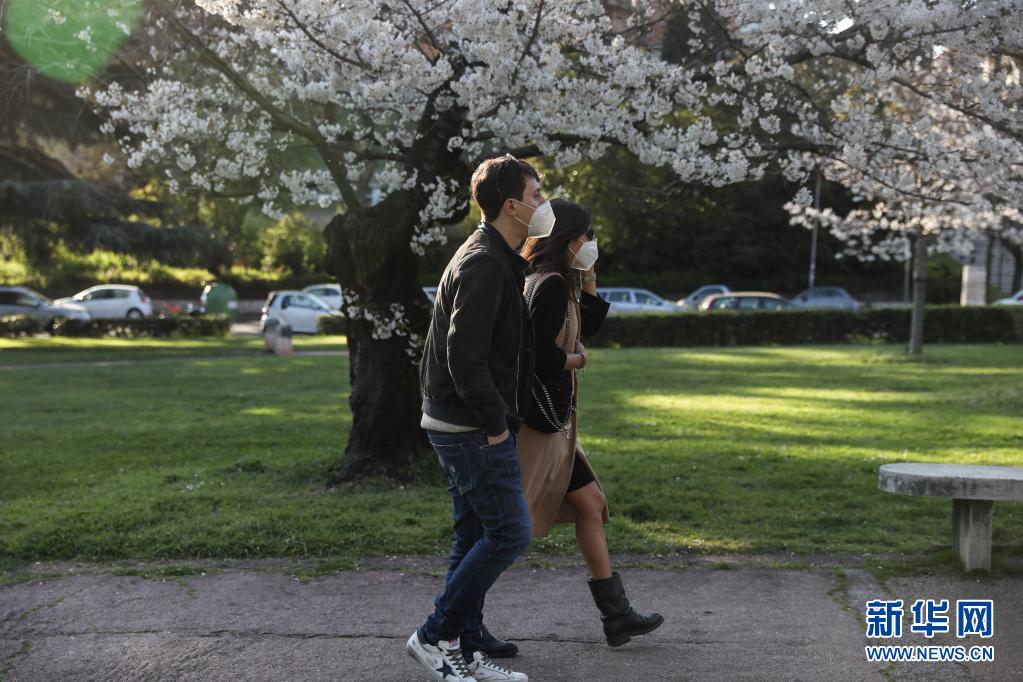 3月24日,佩戴口罩出行的市民從意大利首都羅馬盛開(kāi)的櫻花樹(shù)下走過(guò)。新華社記者 程婷婷 攝