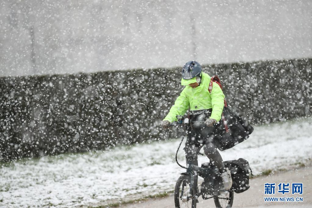 4月6日,一名市民在比利時(shí)布魯塞爾五十周年紀(jì)念公園冒雪騎車。