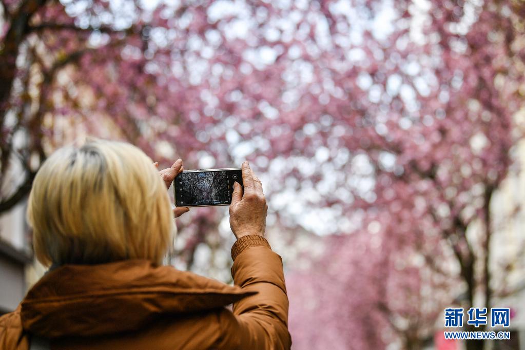 4月13日,一名游人在德國波恩老城區(qū)用手機(jī)拍攝盛開的櫻花。