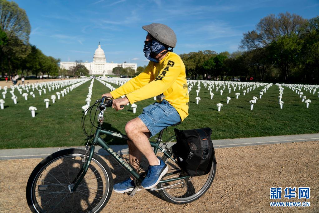 4月13日,一名男子騎車經過美國華盛頓國家廣場草坪上擺放的白色絹花。