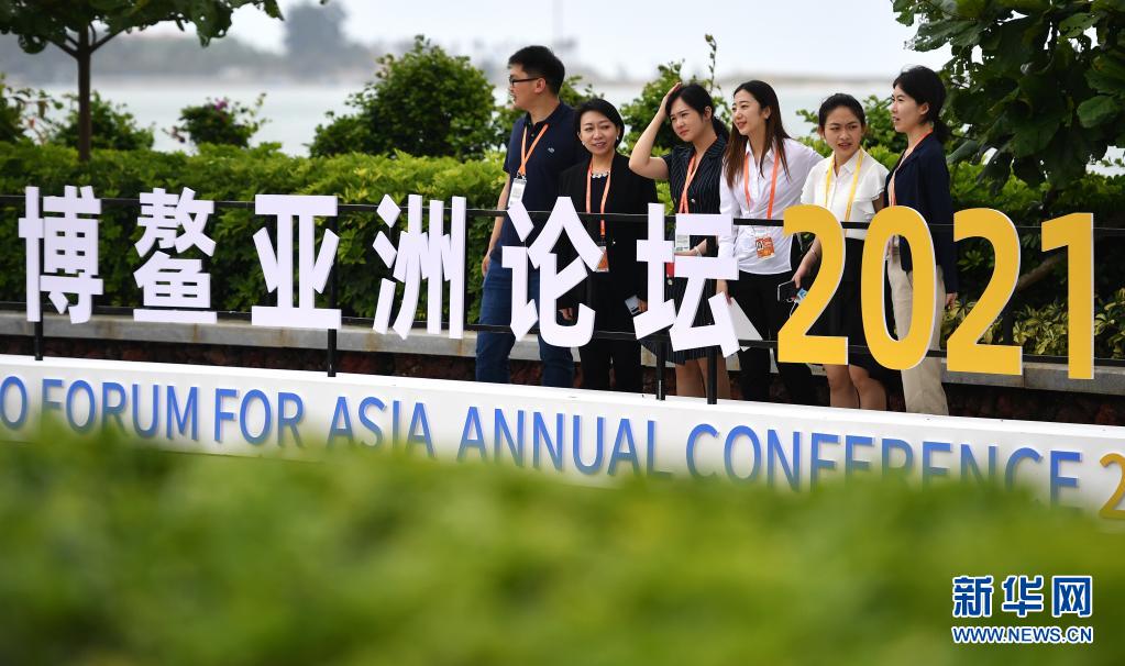4月18日,參會人員在博鰲亞洲論壇2021年年會標(biāo)志前合影留念。