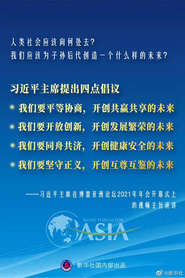 博鰲亞洲論壇2021年年會(huì)開幕式20日上午在海南博鰲舉行,國家主席習(xí)近平以視頻方式發(fā)表主旨演講。面對“人類社會(huì)應(yīng)該向何處去?我們應(yīng)該為子孫后代創(chuàng)造一個(gè)什么樣的未來?”這一重大命題,習(xí)近平主席提出四點(diǎn)倡議。