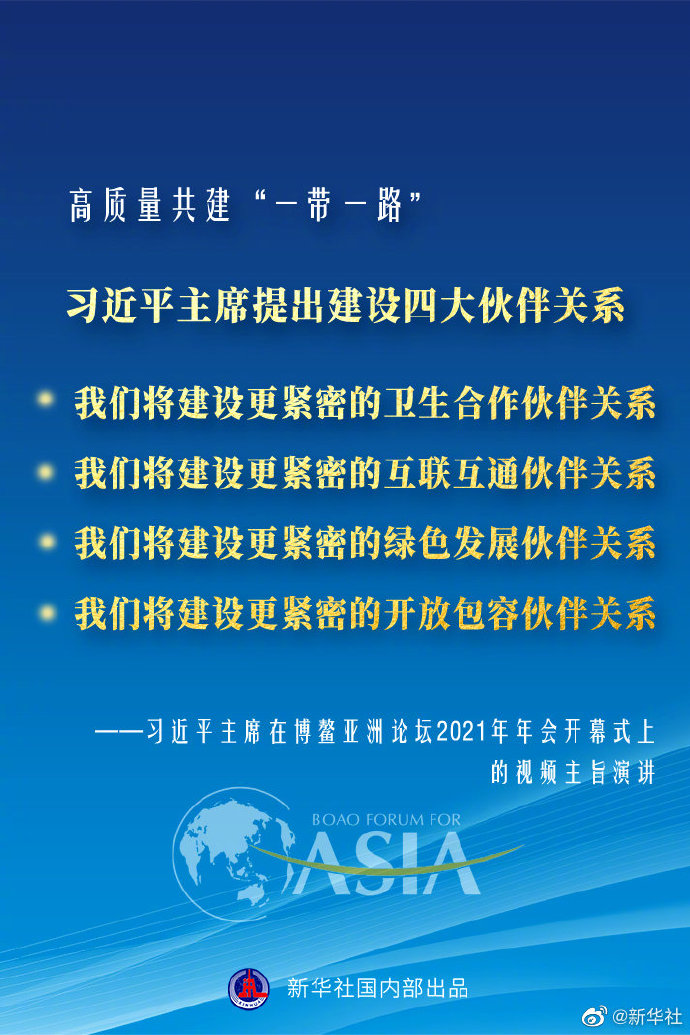 博鰲亞洲論壇2021年年會(huì)開幕式20日上午在海南博鰲舉行,國家主席習(xí)近平以視頻方式發(fā)表主旨演講。針對高質(zhì)量共建“一帶一路”,習(xí)近平主席提出建設(shè)四大伙伴關(guān)系。 ?????
