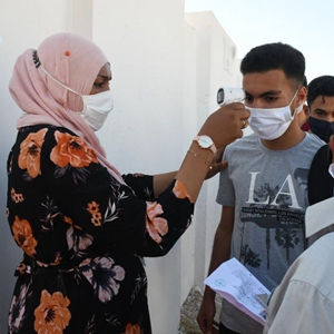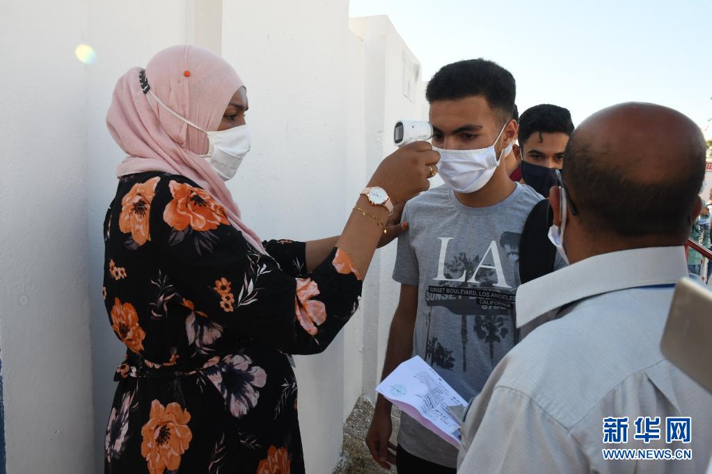 6月16日,工作人員在突尼斯首都突尼斯市一個考場外給準(zhǔn)備參加高等學(xué)校入學(xué)考試的學(xué)生測量體溫。