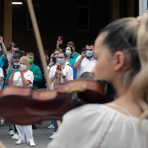 當(dāng)日,羅馬尼亞首都布加勒斯特一個(gè)樂(lè)隊(duì)在該國(guó)一家傳染病醫(yī)院——馬太·巴爾什醫(yī)院演出,向抗擊新冠疫情的醫(yī)務(wù)工作者致謝。