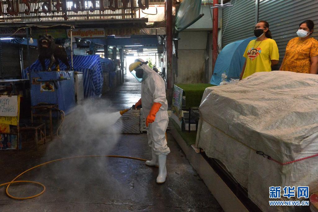 6月21日,工作人員在泰國首都曼谷一處生鮮市場進行消毒。