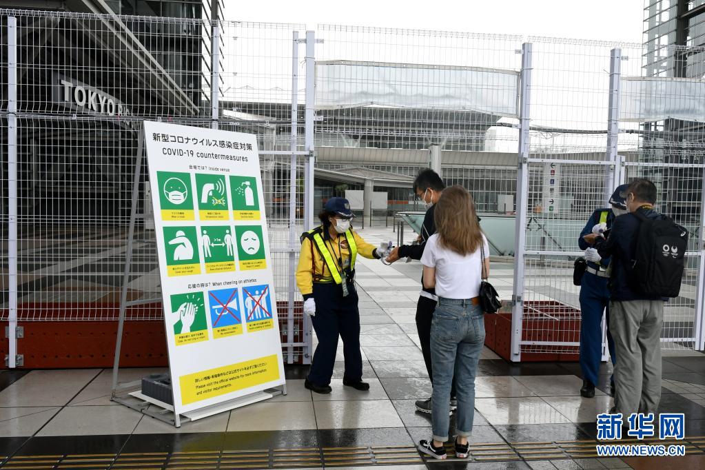 7月1日,工作人員在奧運(yùn)會主新聞中心入口檢查證件和測量體溫。新華社記者 華義 攝